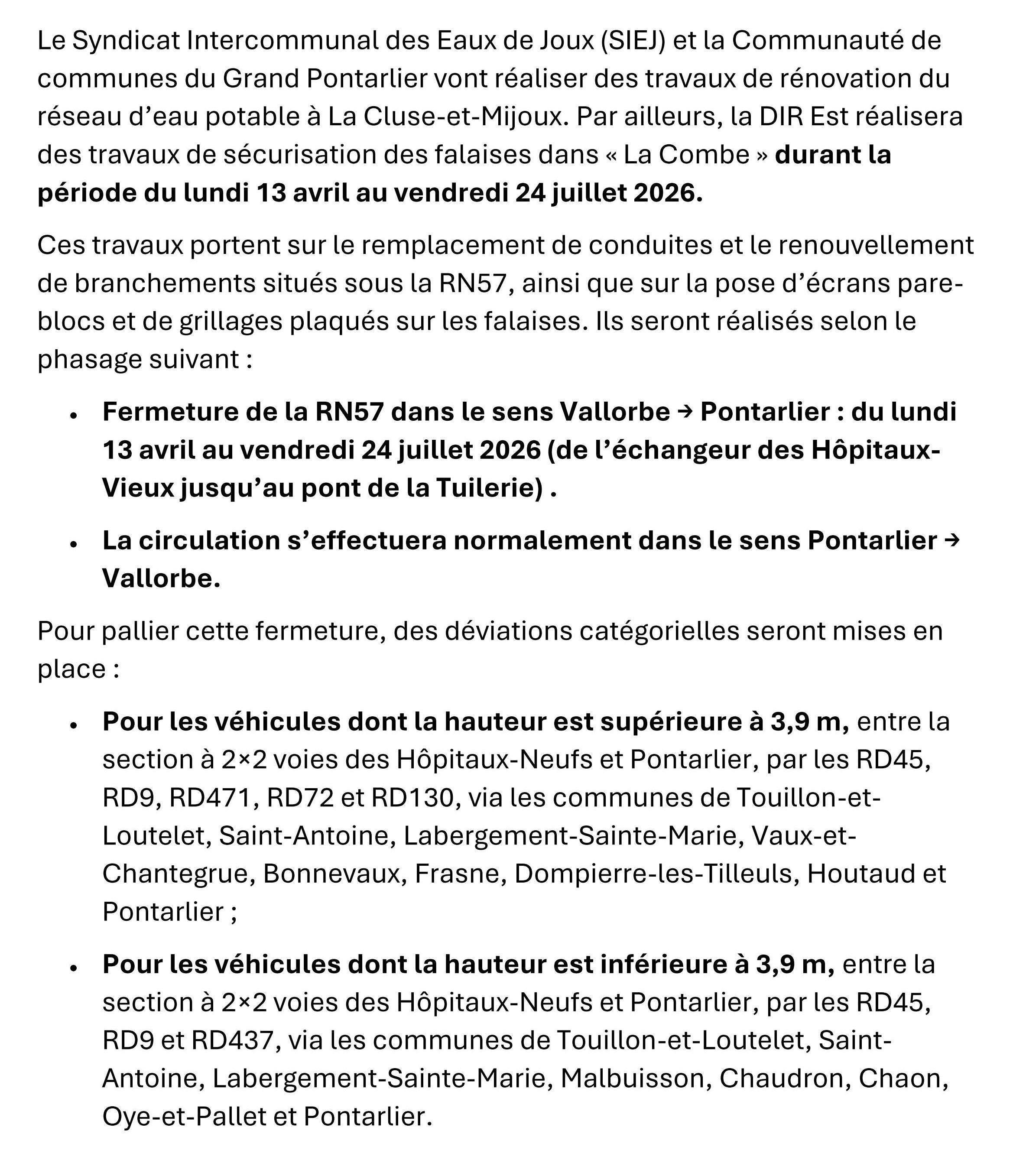 Il faudra donc emprunter la 4 voies pour aller en direction de Jougne.